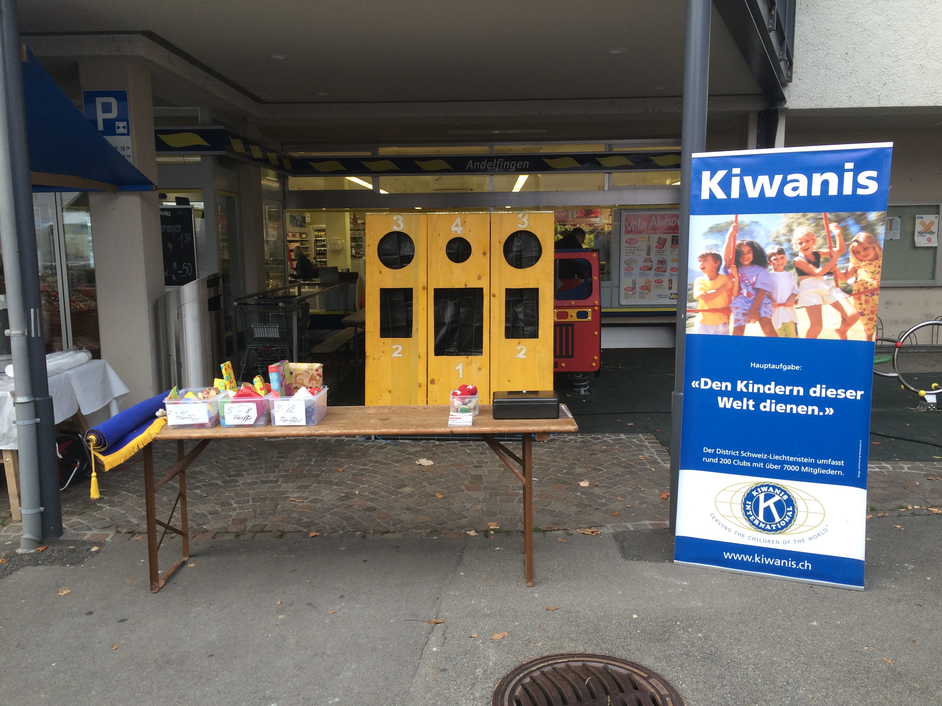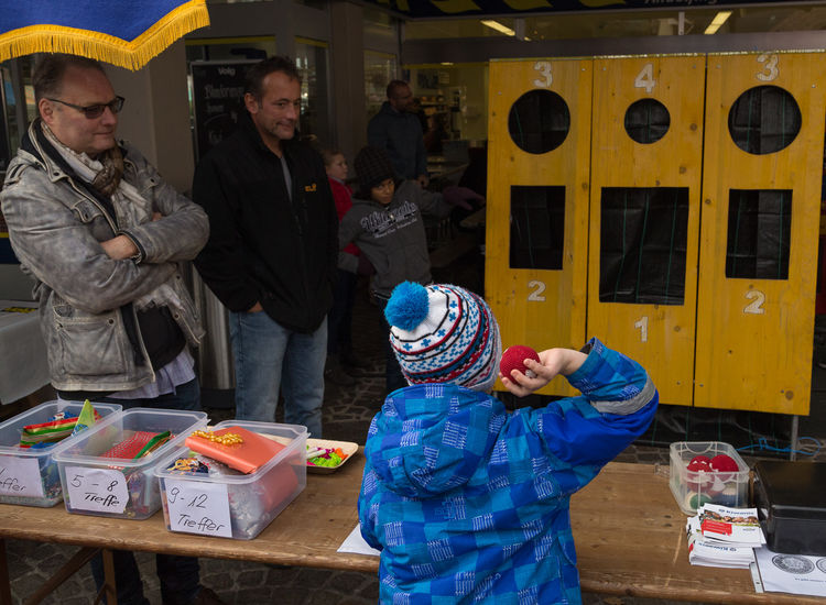 Wie in anderen Jahren bauten wir unseren Wurfstand am Andelfinger Markt auf. Die jungen Marktbesucher nutzen eifrig die Möglichkeit einen oder gar mehrere der farbenfroh verpackten Preise zu gewinnen.